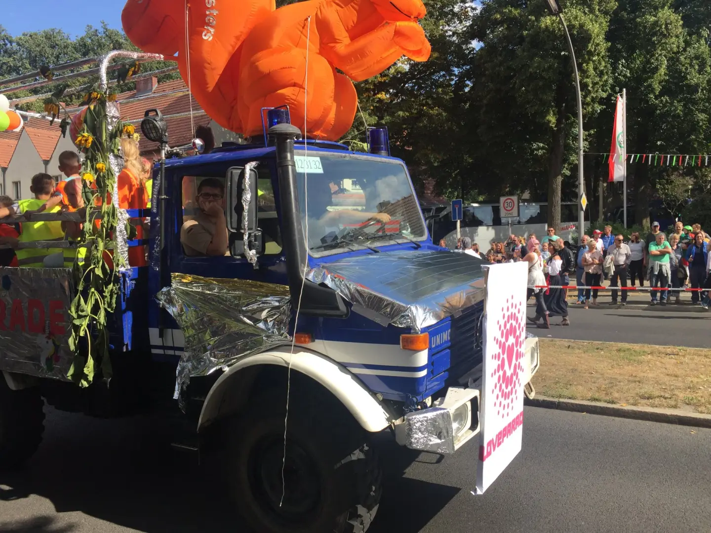 Auf der Pritsche ein Unimog U 401 (Froschauge) vom Bezirksamt Spandau, Gartenbauamt.