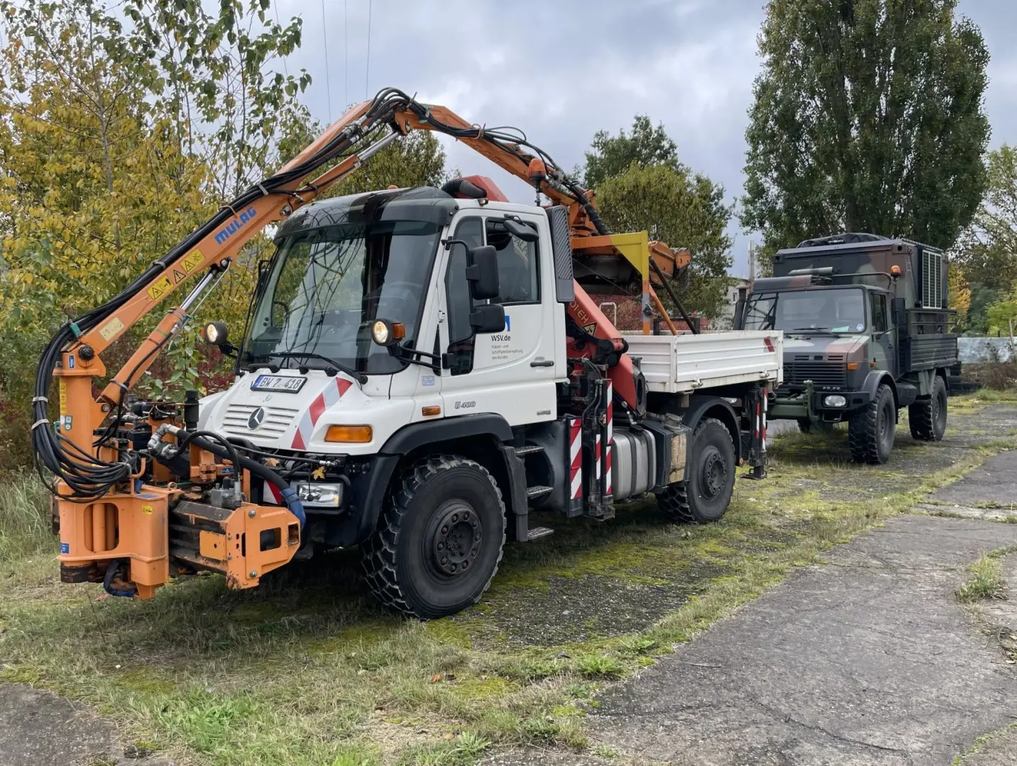 Unimog U400 (weiss) der Wasser- und Schifffahrtsverwaltung (WSV) mit MULAG Frontmähgerät und Palfinger PK 9001 EH Mittelkran,